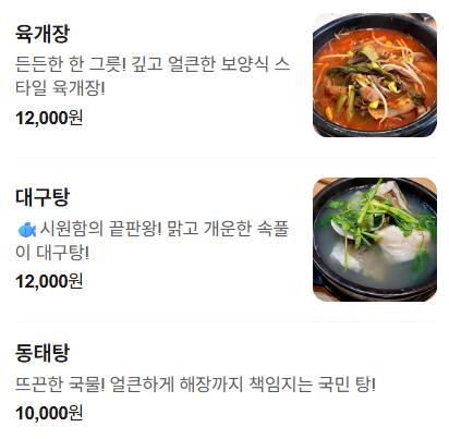 국물 요리를 찾으신다면 두부청국장, 육개장, 대구탕, 동태탕까지 준비되어 있어 계절과 취향에 맞게 선택하실 수 있습니다 🍲