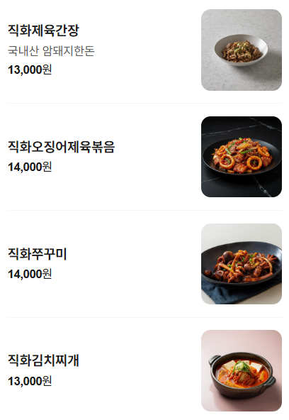 매콤한 조합을 좋아하신다면 직화오징어제육볶음, 쫄깃한 직화쭈꾸미도 추천드리며, 속까지 따뜻해지는 직화김치찌개는 식사의 마무리로 제격입니다. 🍲