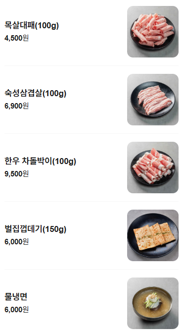 숙성삼겹살, 한우차돌박이 등