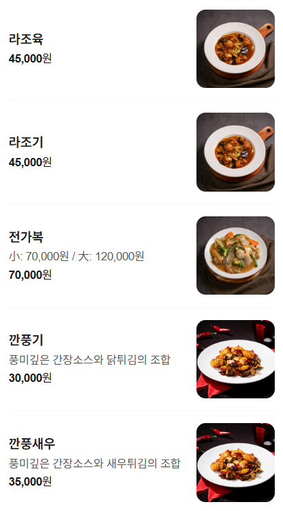 마파두부, 깐풍기, 탕수육,