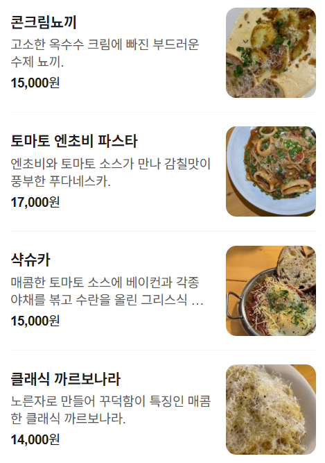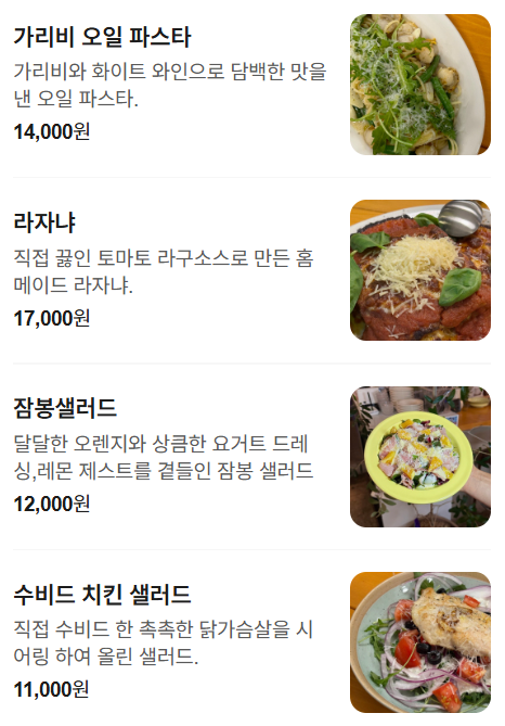 화이트라구파스타와 머쉬룸크림치킨스테이크는 부드럽고 진한 풍미가 일품이에요. 쉬림프로제리조또, 콘크림뇨끼, 가리비오일파스타 등은 식감과 소스의 조화가 탁월하죠. 클래식까르보나라와 라자냐는 정통의 깊이를 그대로 담고 있으며, 잠봉샐러드·수비드치킨샐러드로 시작하는 가벼운 한 끼도 인기가 많아요.