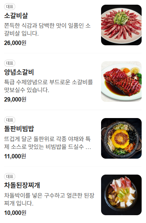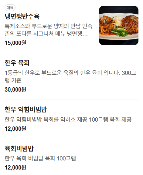 😍 소고기 좋아하시는 분들을 위한 소갈비살·양념소갈비도 준비돼 있으며, 신선함이 생명인 한우육회까지 즐길 수 있어 고기 메뉴의 완성도를 한층 높여줍니다
