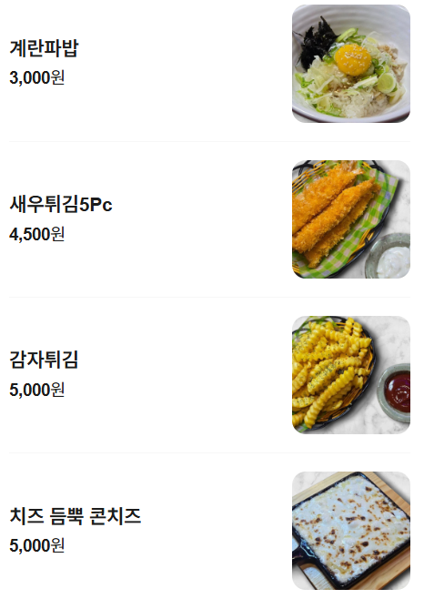 바삭한 새우튀김, 감자튀김, 치즈가 푸짐하게 올라간 콘치즈, 부드러운 들기름계란후라이, 고소한 눈꽃교자, 고급스러운 풍미의 새우버터야끼·관자버터야끼도 꼭 맛보세요.
